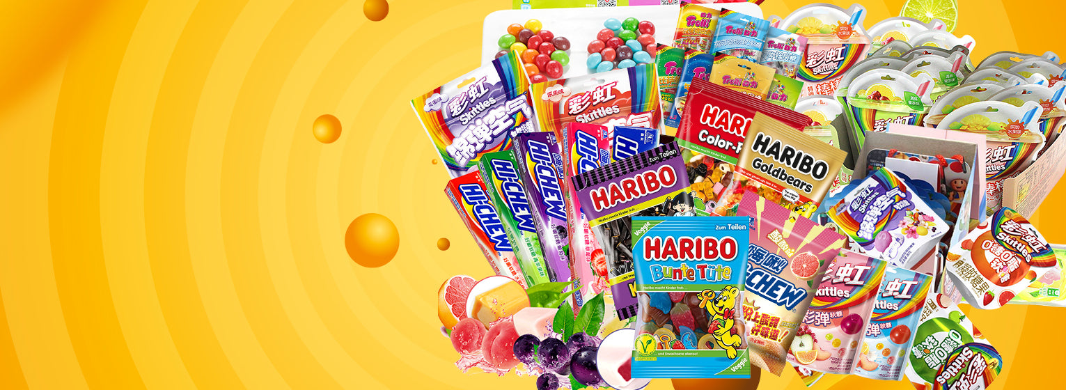 Various Candy as Skittles, Chupa Chups, Hi-chew, Mentos, Haribo, Trolli, Double Mint, Mentos, and so on
